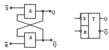 а) реализация RS-триггера на на ЛЭ «2И-НЕ»; б) его условное графическое обозначение на структурных, функциональных и принципиальных схемах.