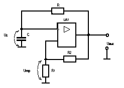 Цепь ПОС содержит делитель, а в цепь ООС входит времязадающая RC–цепь. Форма выходного напряжения близка к прямоугольной. Мультивибратор изменяет свои состояния квазиравновесия в моменты времени, когда напряжение на конденсаторе достигает пороговых уровней