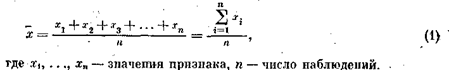 Среднее арифметическое. Среднее арифметическое есть частное от деления суммы всех значений признака на их число. Обозначается оно х. Формула для вычисления имеет вид