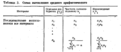 Процедуру вычисления среднего по сгруппированным данным удобно выполнять по следующей схеме (табл. 3).