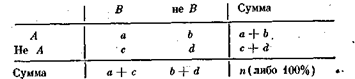 Связь в табл. 2 X 2. Простейшая задача о взаимозависимости возникает тогда, когда имеются два признака, каждый из которых принимает два значения (табл. 13).