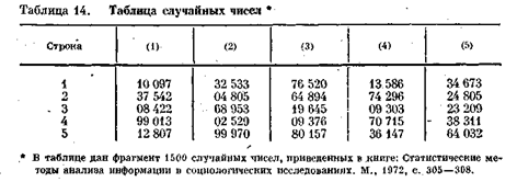 Чтобы устранить трудности, возникающие при исследовании больших генеральных совокупностей (а именно таких большинство в социологии), для реализацию простого случайного отбора пользуются так называемыми таблицами случайных чисел. Они содержат те или иные случайные цифры, полученные путем реализации некоторого физического случайного процесса, В литературе приводятся различные последовательности случайных -чисел объемом от нескольких десятков до миллиона цифр (табл. 14).