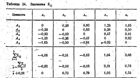 Если Zij оказывается большим, чем 2,0, или меньшим 2,0, оно отвергается как нестабильное. Если ни одна из оценок не отвергается, то шкальная оценка признака i будет равна средней величине всех чисел в графе i табл. 24. Когда, некоторые j отвергаются, то в таблице ставится прочерк. Далее из данных столбца 2 вычитаются данные столбца 1, из 3 — 2 и т. д., а результат заносится в новую таблицу. При этом разность между двумя прочерками или: между значением и прочерком считается незначимой и в матрице ставится прочерк. Для преобразованной таблицы вновь вычисляются средние по столбцам, которые и отождествляются с весом признака измеряемого явления.