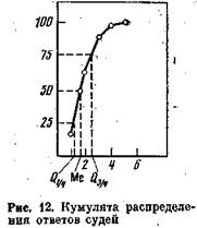 Но кумулятивной кривой распределения находится медиана, • а также нижний и верхний квартили (Q1/4,Q3/4). По графику на рис. 12 для данного случая Мe = 1,7, Q1/4 = 1,3 Q3/ 4 = 2,4. На основании подобных расчетов каждому суждению приписывается вес, равный его медиане. В итоговую шкалу отбираются суждения, „которые, во-первых, сравнительно равномерны по всей шкале (по Me), во-вторых, обладают сравнительно небольшим квартальным отклонением.