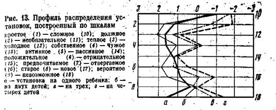 После заполнения опросного листа оценки каждого из респондентов по каждой шкале суммируются, затем вычисляется- средняя арифметическая оценка объекта установки для группы в целом. Если полученные средние нанести на график, составленный из вычерченных в масштабе шкал измерения, и соединить таким образом найденные точки ломаной линией то можно получить профиль данного объекта. На рис. 13 наглядно представлены различия -репродуктивных установок при опросе группы из 107 человек12.