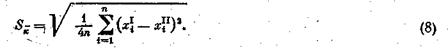 Пусть каждый раз измерение производят два человека, и респонденту приписывается значение в виде средней (х) из двух исходных. Оценку точности такого измерения следует производить по формуле