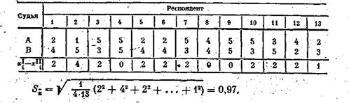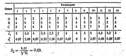 Допустим, что рассмотренную выше совокупность из 13 респондентов оценивают не двое, а трое судей, т. е. добавляется еще одна строчка данных и следующие расчеты: