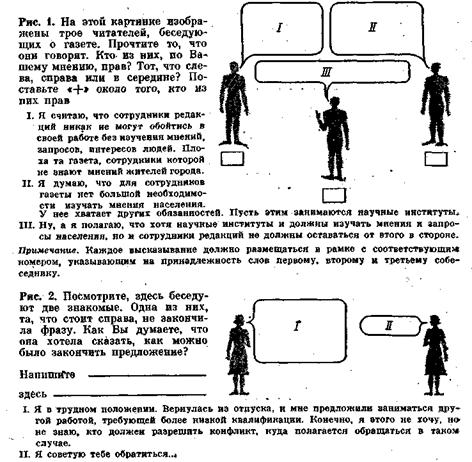 Иногда вопрос-иллюстрация используется для получения высказываний респондента, сформулированных в свободной форме. В этом случае одному из собеседников приписывается определенное суждение или вопрос, а роль второго собеседника предлагается респонденту, который должен ответить на вопрос или завершить начатое высказывание. В упоминавшейся анкете ленинградских социологов предлагался такой вариант вопроса-иллюстрации (рис. 2).