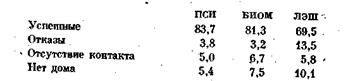 Под «успешным» результатом интервью понималось частичное или полное заполнение вопросника независимо от числа посещений* Разница между результатами, которые получили опытные интервьюеры, и результатами студентов (неопытных интервьюеров) была очевидной во всех трех выбранных для эксперимента районах страны и не зависела ни от предмета опроса (о туберкулезе, чтении или сбережениях), ни от пола и возраста опрашиваемых. Эти результаты (в %) выглядят таким образом: