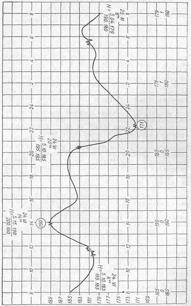 Определение высоты уровня воды производят для каждого установленного при разметке линии записи срока. Для этого строят слева от линии записи шкалу уровней в сантиметрах таким образом, чтобы величина уровня над нулем графика, полученная для первой контрольной засечки при установке ленты, находилась напротив соответствующего деления на шкале. Затем снимают значения высоты уровня в точках пересечения кривой записи со штрихами разметки на 8, 14, 20, 2, 8 ч и выписывают в строчку у соответствующих часовых линий в нижней части ленты.