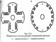Синхронные двигатели изготовляют, как правило, с горизонтальным расположением вала. При частоте вращения 3000 об/мин они имеют ротор с неявно выраженными полюсами, а при частоте вращения от 100 до 1000 об/мин — с явно выраженными полюсами. В машинах небольшой мощности такое исполнение ротора иногда применяют и при частотах вращения 1500 об/мин. В явнополюсных двигателях в полюсные наконечники укладывают короткозамкнутую обмотку, называемую пусковой, аналогичную короткозамкнутой обмотке ротора в асинхронных машинах (рис. 13.4). Она предназначена для осуществления асинхронного пуска синхронных двигателей и повышения устойчивости работы двигателя.