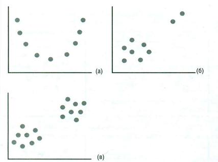 Рисунок 4. Диаграммы, показывающие, когда не следует рассчитывать коэффициент корреляции, (а) - соотношение нелинейно, (б) - при наличии выброса (выбросов), (в) - данные состоят из подгрупп.