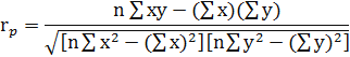 ) определяет силу и направление связи только для количественных данных (x, y – значения исследуемых признаков, n –количество пар данных):