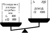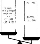 Оставим в стороне предположение (как совсем нереалистичное), согласно которому национальный доход равен нулю, и обратимся к случаю, когда Q = 1000 условных единиц Согласно уравнению (12.7), в этом случае общее потребление равно 1200 (400 + 800). Это значит, что население, получив доход 1000, намерено истратить на потребление 1200, т. е. на 200 больше, чем объем выпуска товаров и услуг. Часть спроса на товары и услуги оно предполагает покрыть за счет накопленных в прошлом сбережений или за счет покупки товаров в кредит. Сбережения в силу этого меньше нуля (—200). Общий совокупный спрос на произведенные в стране товары и услуги окажется больше, чем их совокупное предложение. Превышение совокупного спроса над совокупным предложением означает, что экономика находится в неравновесном состоянии и, следовательно, ее положение неустойчиво: на рынках возникает ситуация общего дефицита, наблюдается повышение цен на все товары и услуги (происходит инфляция). Фирмы стремятся расширять выпуск товаров и услуг, однако они сталкиваются с проблемой финансирования инвестиции, так как сбережения отрицательны.