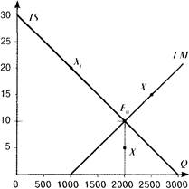 Кривые IS и LM образуют некий крест, пересекаясь в точке Е. Поскольку точка Еп принадлежит и кривой IS, и кривой A/V/, постольку она показывает, при каком уровне национального до хода и при какой процентной ставке будет достигнуто равновесие и на товарном, и на денежном рынках. Эта точка единственная, и это значит, что имеется единственное сочетание уровня национального дохода и процентной ставки, которое обеспечивает равновесие на обоих рынках. Если мы вновь примем те же самые условия, которые мы вводили, когда строили кривую IS, а затем кривую LM, то окажется, что только при уровне национального дохода 2000 и при процентной С1авке 10% в экономике будет до-