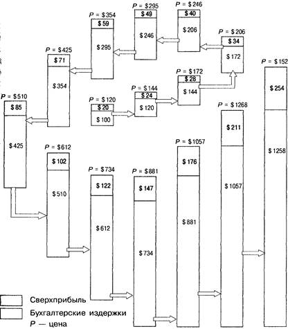 Фирмы добывающих отраслей повысят цены на сырье, ссылаясь на то, что в ближайшем будущем им придется больше платить за поставляемые им факторы производства, а фирмы обрабатывающей промышленности повысят цены на свои товары, заявляя представителям оптовой торговли, что они вынуждены больше платить за сырье и ожидают дальнейшею повышения цен на него. Точно так же поступают оптовики в отношении розничных торговцев, а последние — в отношении домашних хозяйств.