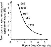 1 Отметим, что указанная закономерность проявляет себя как тенденция В отдель ные годы, например в 1954 г, в 1958 г и в другие годы, не отмеченные на графике имели место весьма существенные отклонения от кривой Филлипса Но зти отклош. ния были вызваны, как правило, внешними факторами, главным образом политичс ского характера