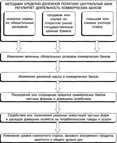 Наряду с правительством, в распоряжении которого находится государственный бюджет, на экономику способен активно воздействовать и Центральный банк. Но в отличие от проводимой правительством бюджетно-финансовой политики, которая непосредственно направлена на регулирование доходов и расходов фирм и домашних хозяйств, на расширение и сокращение государственных расходов, политика Центрального банка регулирует деятель-