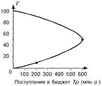 Представленный на рисунке график показывает зависимость величины паю говых поступлении (7) в государственный бюджет от сивки нало)а на при быль (Т*) Если Т" 0 то вея прибыль остается фирмам а в бюджет госуир ства ничего не поступает Ее ш ставка налои» на прибыть бу ict например W\ то в бюджет поступит 200 м ш р дохода Дальнейший рост ставки налои на прибыль будет сопровождаться увеличением дохода государственного бкм жета, пока налоговая ставка не достигнет своею <критического уровня> В <п шем примере он равен 50% При налоговой ставке 50% доход бюджета достш нет своего максимума — 600 мчн р Датьнеишии poei налога на прибыль при ведет к тому что фирмы намнут сокращать выпуск про!укиии а их прибьпи будут уменьшаться Теперь (ем больше будет повышаться налоговая етавм тем меньше продукции будут выпускам фирмы тем меньше будут их прибп ли и тем меньше будет получать государственный бюджет отчислении от при были Есчи недомыслие финансовых руководители государства доведет ет ib ку налога на прибыть чо 100% то фирмы прекратят выпуск товаров и устм их прибьпи упадут до нуля и эта статья доходов бюджета тоже будет paBin нулю