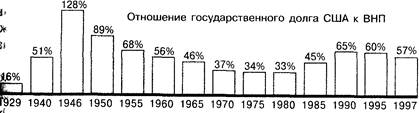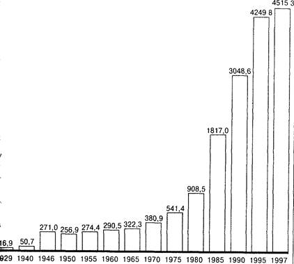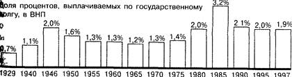 Я Так как в течение многих лет правительствам всех стран при-Лдилось, как правило, прибегать к продажам своих долговых обя-ЙГгельств, чтобы покрыть бюджетный дефицит, то происходило (^происходит увеличение государственного долга. Диаграмма, пред-Йавленная на рис. 16-4, показывает, что в США за период с 1929 иЬ 1997 г. он вырос с 16,9 млрд долл. до 4515,3 млрд долл., т.е. Г237 раз.