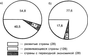 3) положение страны в мировом хозяйстве, о котором мы судим по показателям экспортной и импортной долей, позиции в международном движении капитала и масштабам миграции труда \ В настоящее время имеется несколько вариантов международной классификации стран. Обратимся к варианту, который разработан экономистами Международного валютного фонда (МВФ) Согласно этому варианту классификации, все страны делятся на три группы 1) страны с развитой экономикой (28), в число которых входит 7 крупнейших индустриальных стран (США, Япония, Германия, Франция, Италия, Великобритания и Канада); 2) развивающиеся страны (128); и страны с переходной экономикой (28) Рисунок 17-] показывает, что в 2000 г группа стран с развитой экономикой занимала доминирующее положение в мире и по объему ВВП, и по размерам эскпорта товаров и услуг. Особенно значитель-JHa доля этой группы в мировом экспорте Это говорит о том, что товары и услуги, производимые в этих странах, оказывают заметное Влияние на конъюнктуру внутренних рынков как развивающихся