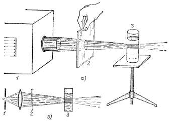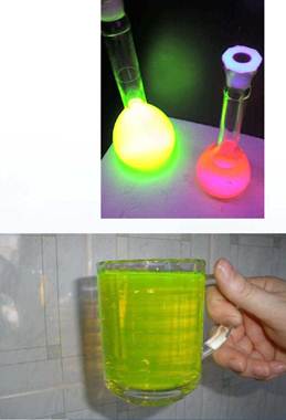 Направим свет от фонаря на фиолетовое стекло, пропускающее только волны фиолетового спектра. Если пучок фиолетового света направить на колбочку, в которой содержится раствор флюоресцеина, то освещенная жидкость начинает ярко люминесцировать зелено-желтым светом.