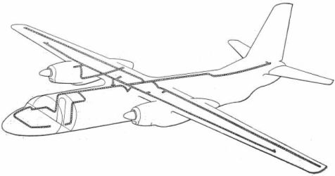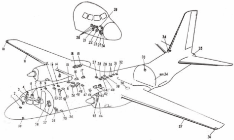 1 – автомат обогрева стекол; 2 – РК кабины экипажа; 3 – щит АЗС; 4 – РК приборов ДИМ; 5 – РК контакторов запуска; 6 – панель переменного тока; 7 – щиток энергетики; 8 – сирена; 9 – РК сигнализации и сброса грузов; 10, 36 – аэронавигационные огни; 11,37 – фары ПРФ-4; 12 – РК флюгирования; 13 – автоматическая панель АПД-27 запуска основных двигателей АИ-24ВТ; 14 – РК гондолы; 15, 46 – коробки включения и регулировки КВР-2; 16, 43 – регуляторы напряжения РН-180 2-й серии; 17, 42 – регуляторы напряжения РН-600; 18 – генератор ГС-24Б; 19 – дополнительный двигатель РУ19А-300; 20 – аккумуляторы; 21 – РК аккумуляторов; 22 – преобразователь ПТ-ЮООЦС; 23 – преобразователь ПО-750; 24 – преобразователь ПТ-200Ц; 25 – блок автоматики топливомера; 26 – коробка переключений и регулирования КПР-9; 27 – механизм выключателей МКВ; 28 – РК топливных насосов; 29, 39 -коробки отсечки по частоте КОЧ-1АН; 30 – автомат защиты от перенапряжений АЗП1–1СД; 31 – блок пожаротушения БИ-7; 32 – РУ управления грузовиком; 33 – приборная доска выпускающего; 34. 38 – проблесковый маяк; 35 – хвостовой огонь; 40 – РК проверки АП; 41 – релейная коробка; 44 – генератор Г016ПЧ8; 45 – стартер-генератор СТГ-18ТМ; 47 – панель ПУ-24АМ; 48 – пусковая коробка ПСГ-1А; 49 – левое центральное распределительное устройство (ЦРУ); 50 – правое ЦРУ; 51 – РК 115 В; 52 – автомат защиты от перенапряжений АЗП-8М; 53 -РК пожаротушения; 54 – РК освещения; 55 – коробка контакторов транспортера; 56 – трансформатор ТС310СО4А; 57 – приборная доска штурмана; 58 – электрощиток штурмана; 59 – датчик РИО-3