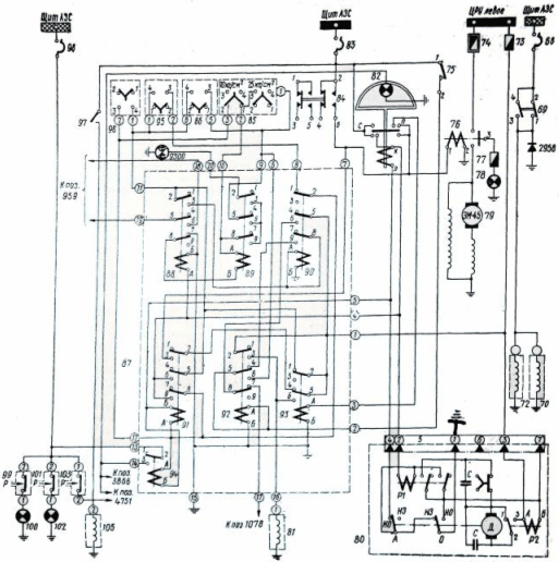 Все входящие в схему реле расположены в одной РК флюгирования, которая установлена на потолке между шпангоутами 10–11; два программных механизма ПМК-18 установлены между шпангоутами 9–10; контакторы флюгерных насосов размещены в левом ЦРУ. Флюгерные насосы установлены на двигателях.