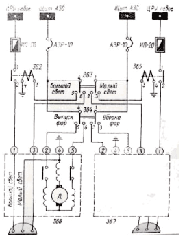 На средней панели приборной доски переключателем 363 устанавливается «Большой свет» или «Малый свет». При положении переключателя «Малый свет» питание фары обеспечивается со щита АЗС через АЗР-10. При положении переключателя «Большой свет» срабатывают контакторы 362У 365 в левом ЦРУ и фары получают питание соответственно через предохранители ИП-20.