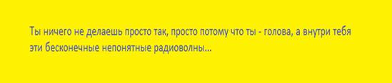 Радиоголова за все годы своего существования выработала иммунитет ко всему ей ненужному, невкусному и неинтересному, впрочем, даже тишина совсем не радует её(((Некая неизвестная теория реальности ворвалась на её территорию и водрузила свои флаги и расставила всюду свои метки шести разных цветов. А цвета были следующие: черный, белый, красный, жёлтый, зелёный, синий. Собственно, это и был весь спектр жизни Радиоголовы) И поскольку вся эта теория основывалась на абстрактной картине её собственного мироощущения, ей, то есть Радиоголове, предстояло понять, какой флаг установлен в самом центре её сознания...
