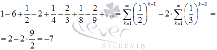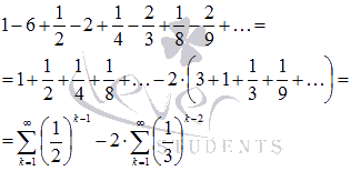 Каждый из этих рядов представляет собой сумму бесконечно убывающей геометрической прогрессии, следовательно, является сходящимся. Третье свойство сходящихся рядов позволяет утверждать, что исходный числовой ряд сходится. Вычислим его сумму.