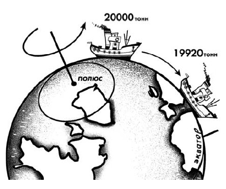 Земной шар, на котором мы живем, вращается, и вследствие вращения Земли все вещи на ее поверхности становятся легче. Чем ближе к экватору, тем больший круг успевают сделать вещи за 24 часа, тем, значит, они быстрее вращаются и оттого больше теряют в весе. Если килограммовую гирю перенести с полюса на экватор и здесь вновь взвесить на пружинных весах, то обнаружится нехватка в весе на 5 г. Разница невелика, конечно, но чем тяжелее вещь, тем нехватка крупнее. Паровоз, приехавший из Архангельска в Одессу, становится здесь легче на 60 кг – вес взрослого человека. А линейный корабль в 20 тыс. тонн, прибывший из Белого моря в Черное, теряет здесь в весе ни мало, ни много – 80 тонн; это вес хорошего паровоза!