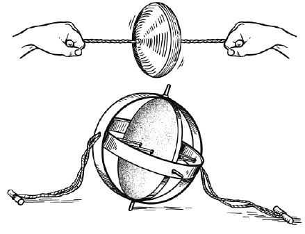 Вырежьте кружок из плотного и прочного картона, вершков 5–6 в диаметре, и по обе стороны его центра просверлите по дырочке. Сквозь эти дырочки протяните бечевки. Такой кружок легко привести в быстрое вращательное движение; для этого нужно, слегка натянув бечевки, обернуть кружок несколько раз и затем, когда бечевки закрутятся, отпустить его, сильно натянув бечевки: кружок завертится довольно быстро (рис. 29).