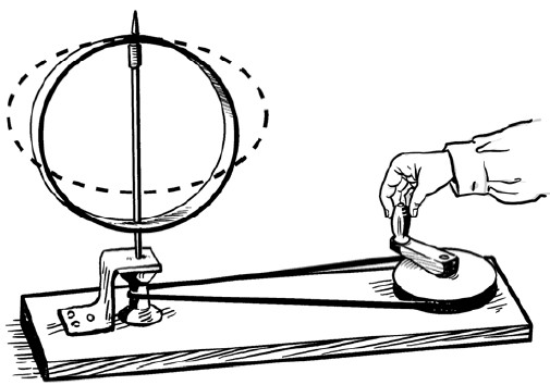 Описанный сейчас опыт удобнее показывать, если смастерить себе упрощенную центробежную машину, вроде той, которая представлена на рис. 30. Катушка, которую вы вертите рукой, должна иметь больший поперечник, чем та, которая вращает кружок; чем разница в диаметрах больше, тем больше оборотов будет делать бумажное кольцо, и тем опыт выходит показательнее.