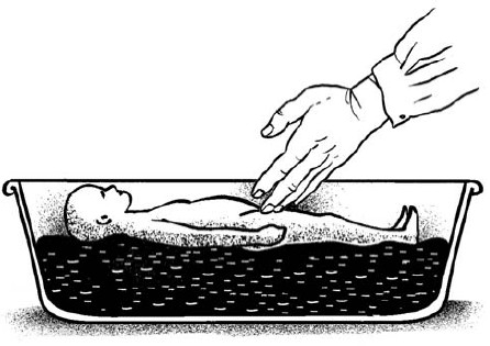 Если вспомним, что еловая древесина чуть не в тридцать раз легче ртути, то поймем, что кусок такого дерева, плавая в ртути, должен погружать под ее уровень всего лишь 30‑ю долю своего объема. Примерно так же мелко плавало бы в ртутном озере и человеческое тело; восковая кукла, изображенная на рис. 38, наглядно показывает различие между плаванием человеческого тела в воде и в ртути. В воде, как мы знаем, кукла едва выступает над уровнем жидкости; в ртути та же кукла, напротив, почти целиком находится вне жидкости, погружаясь в нее чуть заметно для глаза.