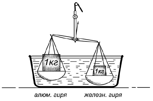В нашем случае чашки весов сами по себе теряют под водою одинаковый вес (они одной величины). Но гири теряют в весе не одинаково: крупная алюминиевая вытесняет больше воды, нежели мелкая железная; поэтому алюминиевая теряет в весе больше железной; останется же веса в алюминиевой гире меньше, чем в железной.