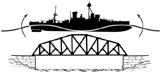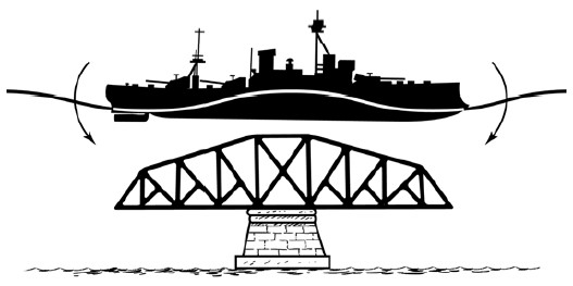 Происходит это вот почему. Когда большой пароход скользит по волнующемуся морю, он то зарывает в воду нос и корму, то, напротив, освобождает их от воды, погружая в волну середину своего корпуса. Какие же силы действуют на судно в том и в другом случае? Когда концы корпуса в воде, а середина вне воды, то вес носа и кормы облегчается выталкивающим действием воды, середина же сохраняет свой вес почти полностью. Корпус корабля подвергается при этом таким же усилиям, как и мостовая ферма, подпертая на концах; вес стремится прогнуть середину сооружения вниз. В обратном случае, когда корма и нос почти вне воды, середина же корпуса в воде, перевешивают концы парохода, – их вес не уменьшается поддерживающим давлением воды. Это то же самое, что подпереть мостовую ферму в середине. Ясно, что концы сооружения, не подпертые снизу, будут стремиться изогнуть его середину вверх.