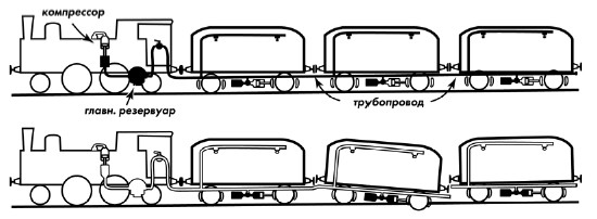 Рис. 69. Устройство воздушного тормоза для остановки поездов. Внизу показано, как действует тормоз в случае разрыва поезда. На обоих рисунках зачернены части, заполненные сжатым воздухом