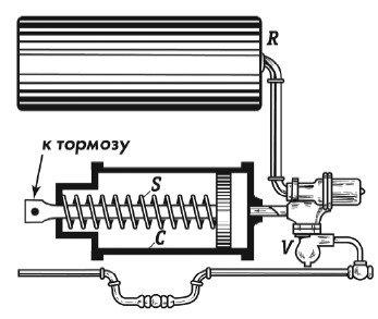 Рис. 70. Подробности устройства воздушного тормоза. Когда тормоз не работает, клапан Y закрыт, и сжатый воздух из баллона R не идет в цилиндр С; пружина S оттягивает стержень, соединенный с тормозной колодкой