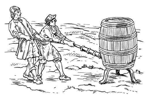 «Этот недостаток надо было устранить каким‑ни‑будь способом; я достиг этого, взяв бочку меньших размеров и поместив ее внутри первой. Пропустив трубу более длинного насоса через дно обеих бочек, я велел наполнить водой меньшую бочку, законопатить ее отверстие и затем, наполнив водой также большую бочку, вновь начал работу. Теперь вода выкачивалась из маленькой бочки и, несомненно, оставляла в ней после себя совершенно пустое пространство.