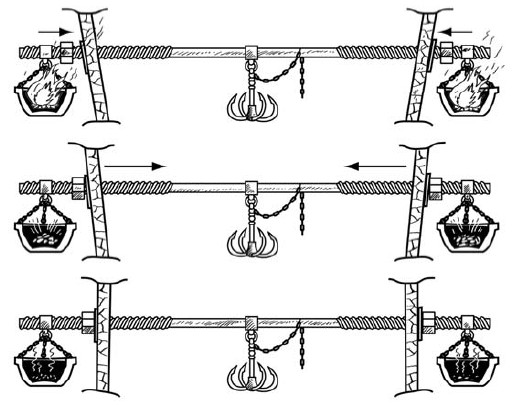 «Он начал с того, что в стенах строения на довольно значительной высоте приказал просверлить одно над другим два ряда отверстий величиною в руку. С любопытством ожидали, что из этого будет; но когда, спустя несколько недель, из отверстий показались концы толстых железных болтов с крупною винтовою нарезкою, то все, кто ждал от Моляра успеха, потеряли всякую надежду, а члены комиссий, начинавшие было сомневаться в правильности своих решений, ободрились. Стянуть дом болтами казалось слишком безрассудно. Откуда взять силу, чтобы навинтить гайки, преодолевая вес тяжелых стен? Между тем к каждому болту был прикреплен якорь о четырех лапах; якоря эти могли выдержать значительное давление. Под нижним рядом болтов, проходивших через все здание, были устроены четырехугольные очаги из листового железа, которые привешивались к болтам. Для чего они – никто не понимал.