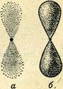 Объем пространства с 90%-ой вероятностью пребывания в орбитали этого вида состоит из двух половин, расположенных симметрично относительно выбранной оси вращения. Ось расположена в вертикальной плоскости, отделяющей половины объема друг от друга и называемой узловой плоскостью (на рис. 5 ось изображена в виде точки).