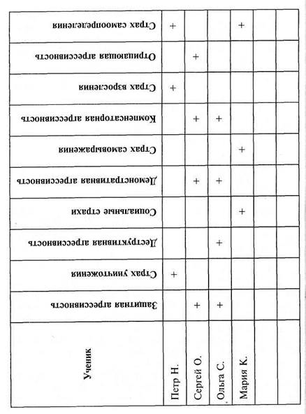 Для всех ребят группы особого внимания заполняется карта нарушений психологического здоровья по схеме (см. стр. 64), которая составляется с учетом активного (агрессия) и пассивного (страхи) вариантов проявления нарушений психологического здоровья.