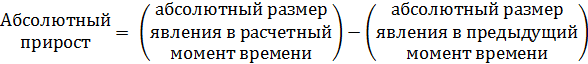 Абсолютный прирост или убыль характеризует изменение явления в единицу времени (за интервал времени). Получается путем вычитания из данных последующего периода данных предыдущего. Если ряд возрастает, то прирост положителен. Если убывает — отрицателен (убыль). Этот показатель не может использоваться при сравнении динамики разнородных данных (вес в кг, рост в см). Кроме того, на его значение оказывает влияние и абсолютный размер анализируемой характеристики. Например: рост в см — трехзначное число, окружность бедра в см — двухзначное.