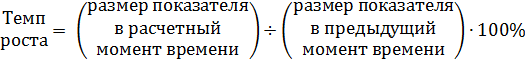 Темп роста или снижения показывает соотношение в процентах последующего уровня и предыдущего, поэтому может использоваться при сравнительном анализе динамики разнородных величин. Получается путем деления последующего уровня на предыдущий и умножения на 100. Если прирост положителен, то показатель больше 100%, если отрицателен — меньше 100%.