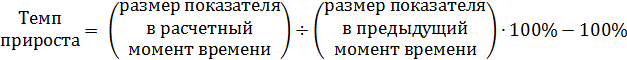 Темп прироста показывает, на сколько процентов увеличился или уменьшился уровень явления. По существу отражает относительную скорость изменения явления от одного отрезка времени к другому. Вычисляется путем деления абсолютного прироста на предыдущий уровень, либо вычитанием из показателя темпа роста 100. Если прирост положителен — показатель больше 0. Если отрицателен — меньше.