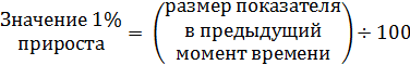 Абсолютное значение 1% прироста характеризует значение 1% прироста изучаемого явления. Этот показатель может вычисляться делением абсолютного прироста на темп прироста или делением показателя предыдущего уровня на 100.