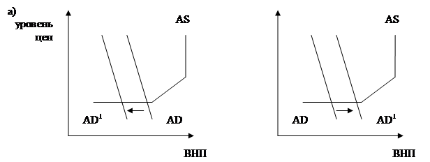 На рисунке 10.1-а кривая совокупного спроса AD переместилась влево –в положение AD1. Определите: фазу цикла; характер динамики ВНП; характер динамики уровня цен; характер динамики уровня безработицы;