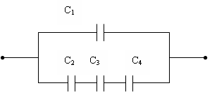 616. Чему равна общая емкость батареи конденсаторов, соединенных как показано на рисунке, если С1=6 мкФ, С2=С3=С4=3 мкФ?