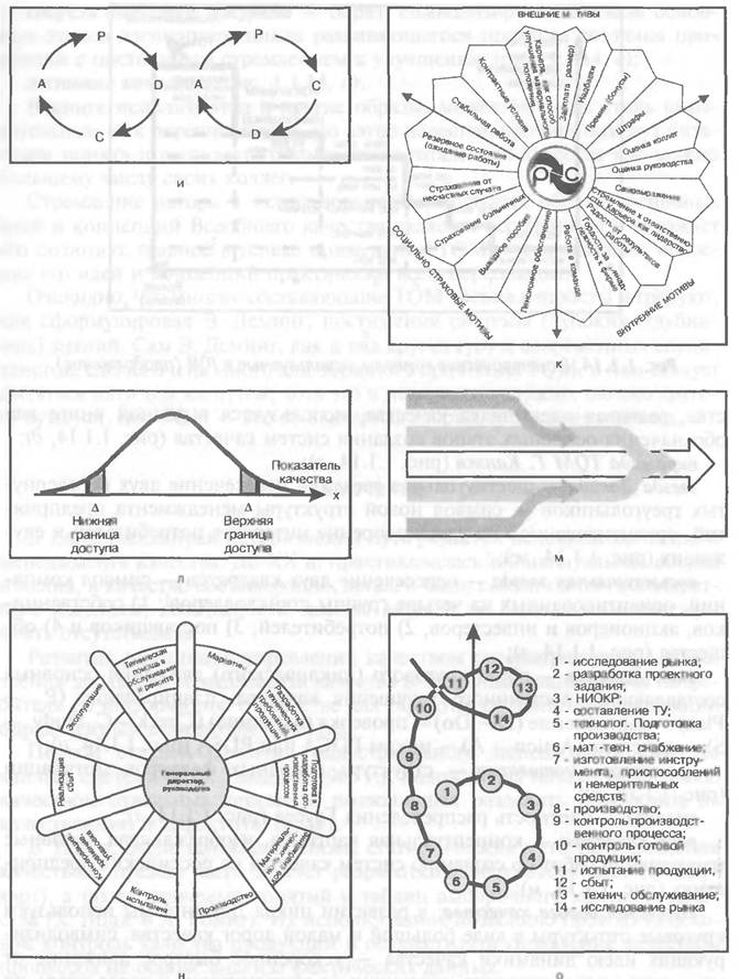 - кольцевая дорога качества; в развитии цикла Деминга мы используем круговые структуры в виде большой и малой дорог качества, символизирующих идею динамики качества — ускоренное быстрое движение от маркетинга через создание продукции до эксплуатации и далее вновь по дороге качества;